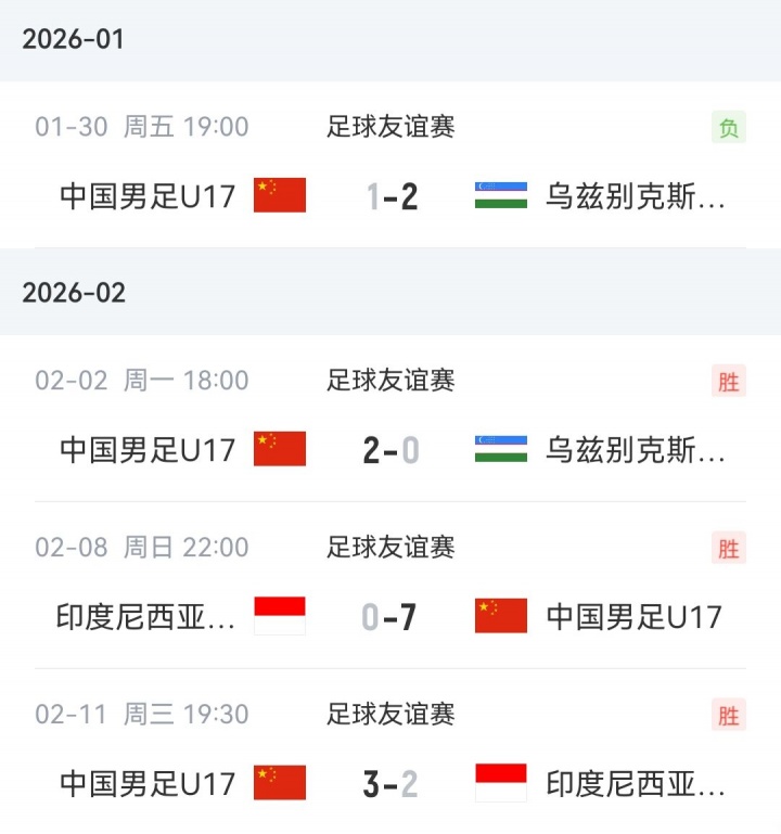 近日,U17国足组织了今年首期集训,分别与乌兹别克斯坦U17和印度尼西亚U17进行了2场比赛,取得了3胜1负的战绩。